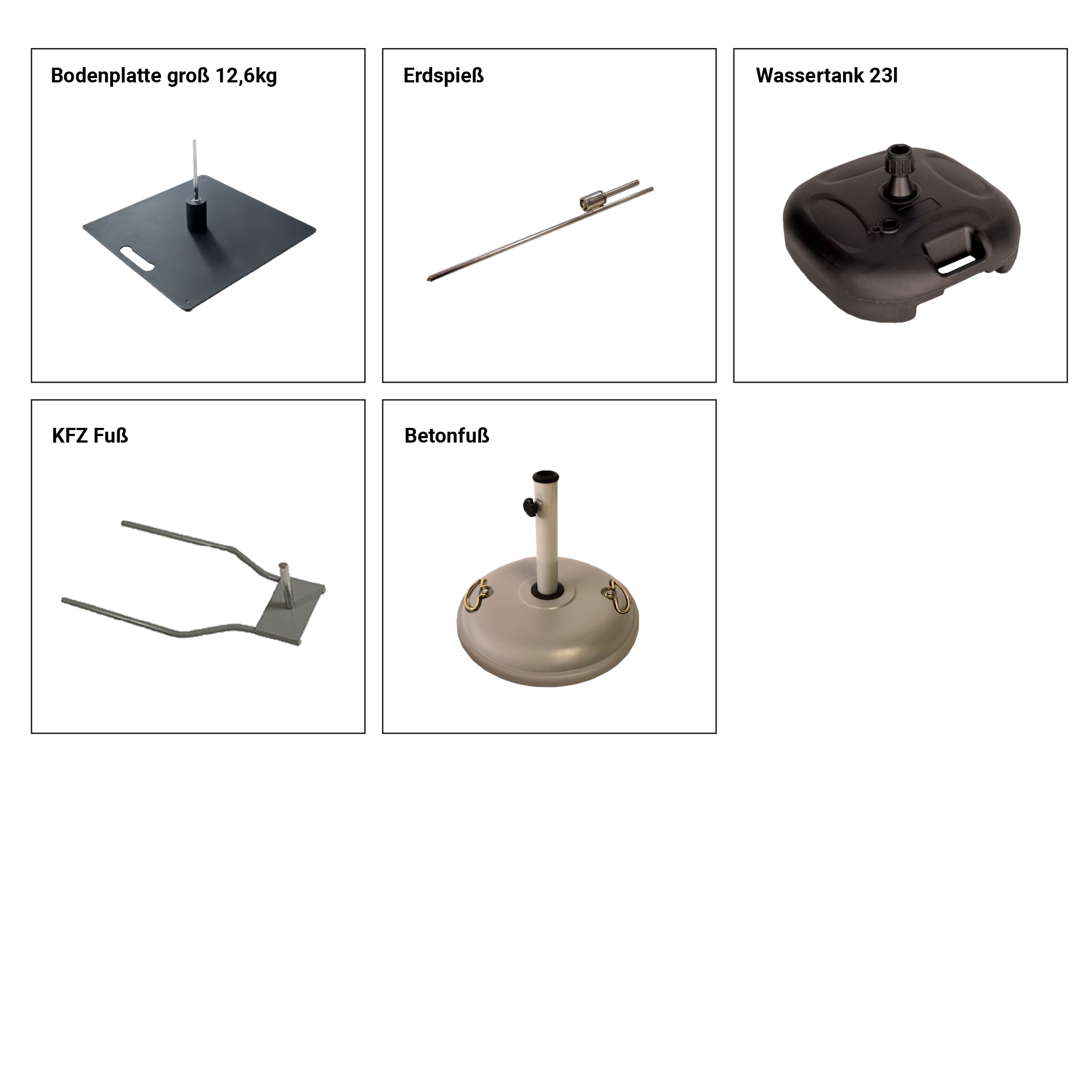 Für die Fahne sind zudem verschiedene Standfüße erhältlich, damit auf jedem Untergrund ein stabiler und sicherer Stand ermöglicht werden kann - egal ob Asphalt, Rasen, Sand oder Schnee. Soll die Fahne auf dem Boden stehen, so kann zwischen Kreuzfüßen, Bodenplatten, Wassertank, und KFZ-Fuß gewählt werden, mit einem Erdspieß hingegen kann die Fahne im Boden verankert werden. Um die optimale Standfestigkeit zu gewährleisten, kann bei der Verwendung eines Kreuzfußes oder einer Bodenplatte zusätzlich ein Wasserring zur Beschwerung verwendet werden.