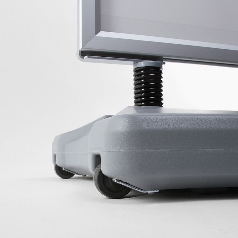 Speziell für Ihre Werbung in windigen Bereichen ist der Kundenstopper WINDTALKER® von City Medien 24 in Wiesbaden die optimale Lösung. Sein mit Wasser oder Sand befüllbarer Standfuß bietet in Verbindung mit den Spezialfedern aus Stahl eine hohe Standfestigkeit. Für den einfachen Transport sind im Standfuß Rollen integriert. So können Sie den Kundenstopper trotz des Standgewichtes einfach bewegen. Der Aluminium-Schnellwechselrahmen kann doppelseitig mit Plakaten bestückt werden und garantiert Ihnen auch bei hohen Windstärken eine auffällige Werbemöglichkeit.