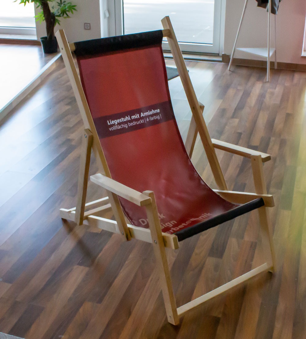 Hochwertiger Klappholzliegestuhl mit Armlehne mit strapazierfähigem Latexdruck drucken. Strandstühle bedruckt in Wiesbaden von City Medien 24.
