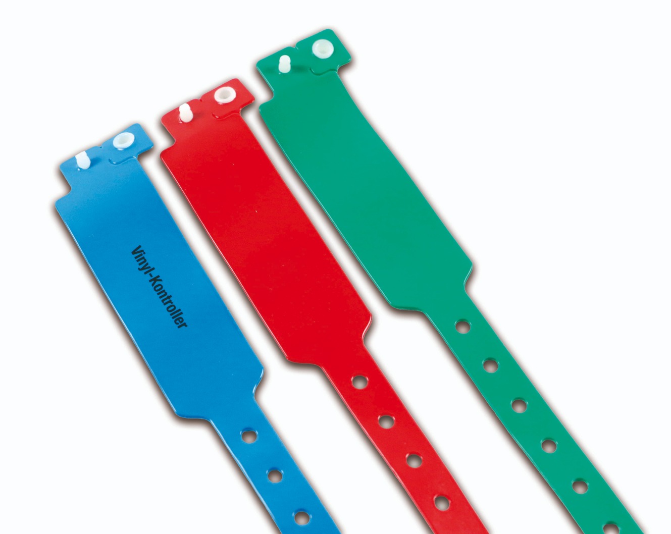 Bedruckte Einlassbänder von City Medien 24 in Wiesbaden aus Vinyl, höchster Tragekomfort, nicht übertragbar in 21 Farben.